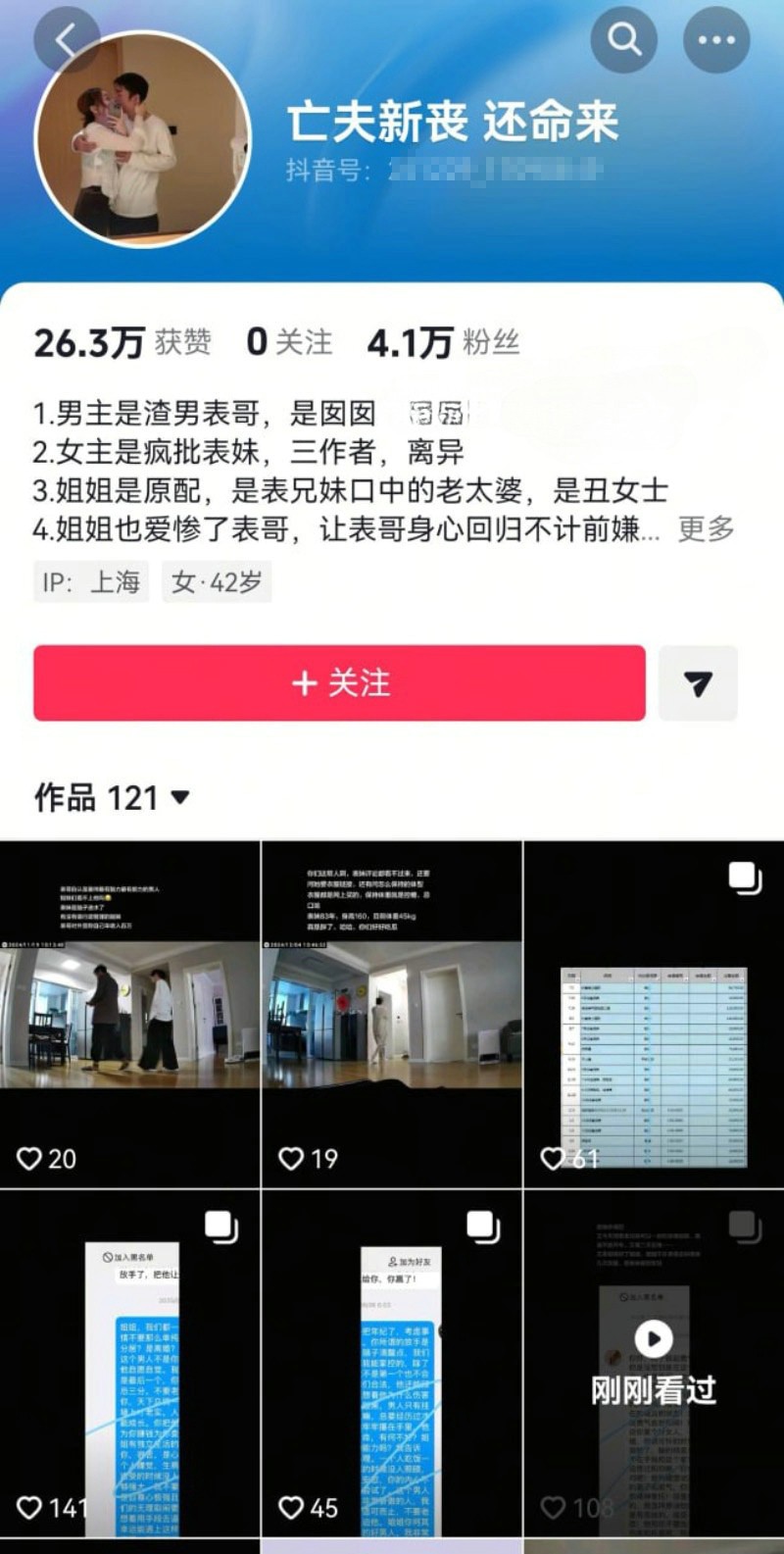 上海家庭伦理大戏 疯批表妹爱上渣男表哥 婚外情8年小四爆料全网疯传 原配忍气吞声